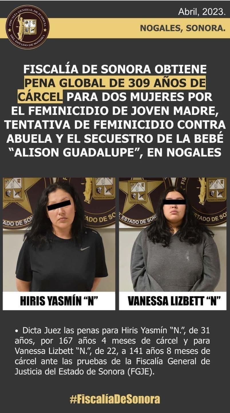 Tras un intenso operativo de agentes AMIC, la Fiscalía de Sonora localizó en domicilio de Agua Prieta a la pequeña Alison Guadalupe sana y a salvo, deteniendo a Hiris Yasmín “N.” y Vanessa Lizbett “N.”, que concluyó con la sentencia de 309 años para las dos.